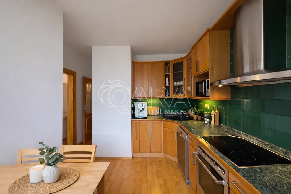 Jednotka se nabízí kompletně vybavena kvalitním, dřevěným nábytkem, viz fotografie. K dispozici jsou čtyři samostatné, neprůchozí pokoje, vhodné jako ložnice, pracovna nebo dětské pokoje ve kterých jsou vestavěné skříně. Z hlavní ložnice je vstup také na prostorný balkon. Obývací pokoj je vybaven koženou sedací soupravou a plynule navazuje na kuchyň. Ta je plně vybavena kvalitními spotřebiči značky AEG (lednice s mrazákem, myčka, trouba, varná deska, digestoř, kávovar) a nabízí dostatek úložného prostoru i nádobí.