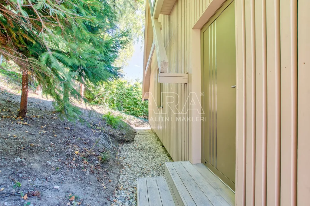 Dominantou je velkoformátové prosklení, které se táhne od podlahy až ke stropu a otevírá fascinující výhledy do okolní krajiny. Tento jedinečný architektonický prvek nejenže zaplaví interiér přirozeným světlem, ale zároveň vám poskytne přímý vstup na terasu, která se stane dokonalým místem pro odpočinek a pozorování přírody. Celkový design dokonale vybízí k vybavení v skandinávském stylu, který pracuje se světlými barvami a přírodními materiály.