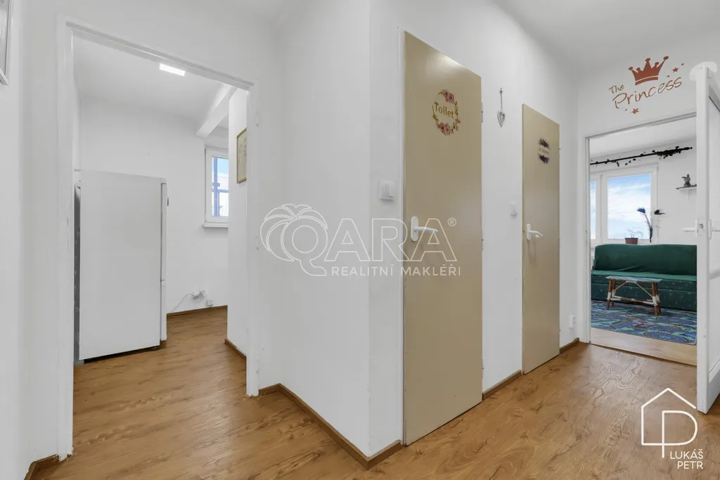 Nabízí poctivou a dobře využitelnou dispozici, která dnes u podobně velkých bytů nebývá samozřejmostí. Velkým benefitem je ložnice o velikosti téměř 20 m and sup2; se dvěma okny, kterou lze rozdělit na dva samostatné pokoje. Byt tak může po úpravě fungovat i jako 3+1. Dispozici tvoří vstupní chodba, samostatná kuchyně, obývací pokoj, velká ložnice, koupelna s vanou a oddělené WC.