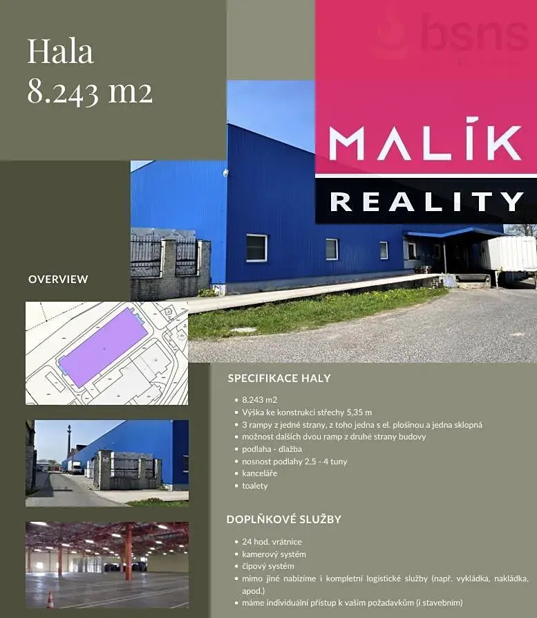Hala je vhodná jak pro logistické a skladové operace, tak pro lehkou či střední výrobu. Dispoziční řešení umožňuje flexibilní přizpůsobení prostoru dle konkrétních potřeb nájemce.