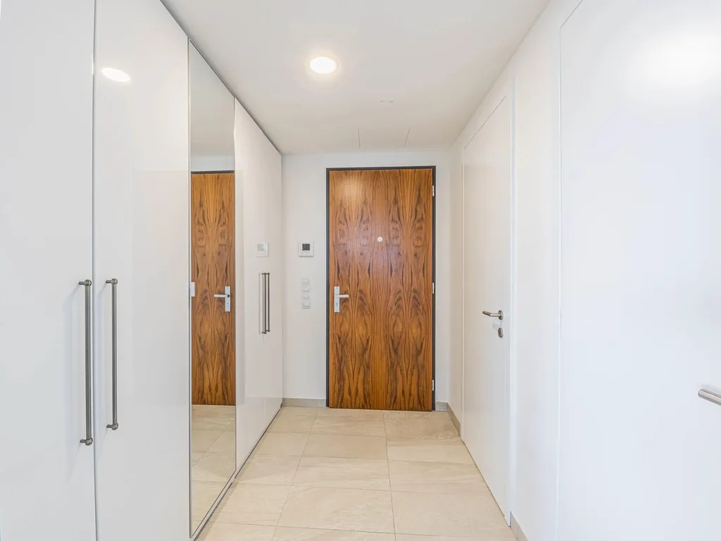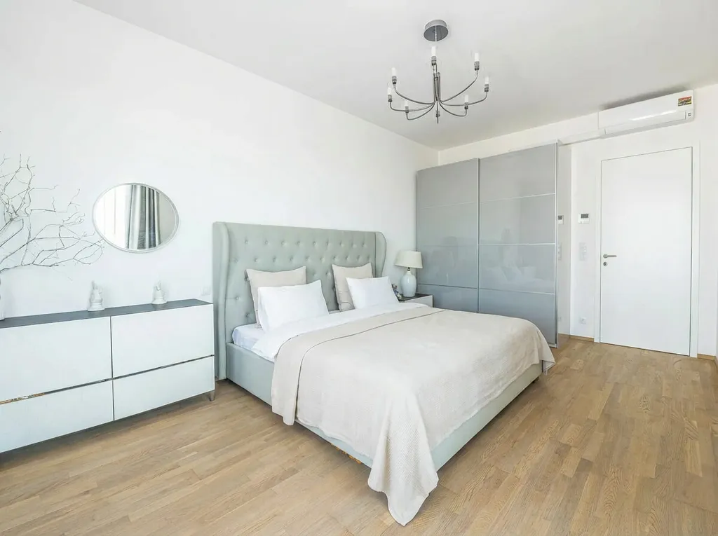 V bytě jsou dřevěné podlahy a dlažba, TV, klimatizace, bezpečnostní vstupní dveře, videotelefon a podlahové vytápění v koupelně.