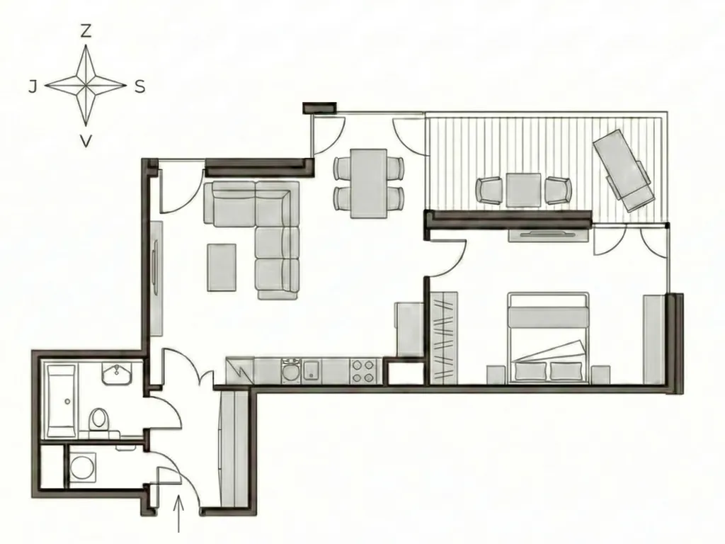 Byt nabízí praktické a velmi příjemné dispoziční řešení. K dispozici je prostorný obývací pokoj s kuchyňským koutem a jídelní částí, samostatná ložnice, koupelna s vanou, technická místnost pro pračku a vstupní chodba s úložnými prostory.