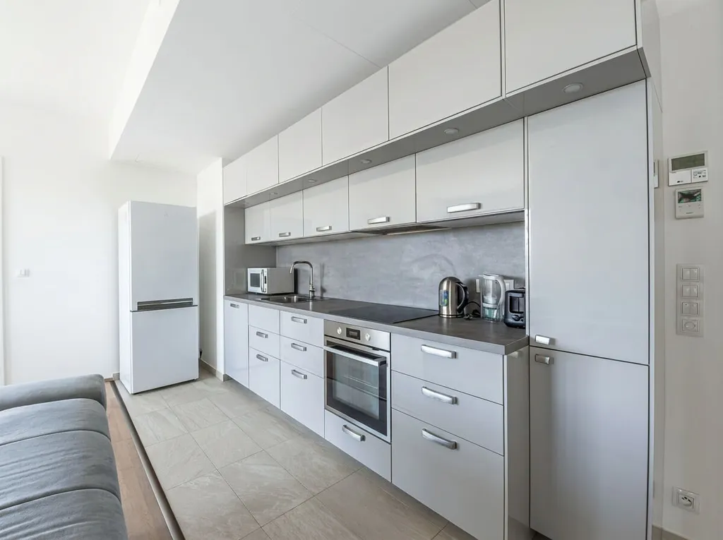 Kuchyňská linka je vybavena lednicí, varnou deskou, troubou, mikrovlnnou troubou a myčkou.