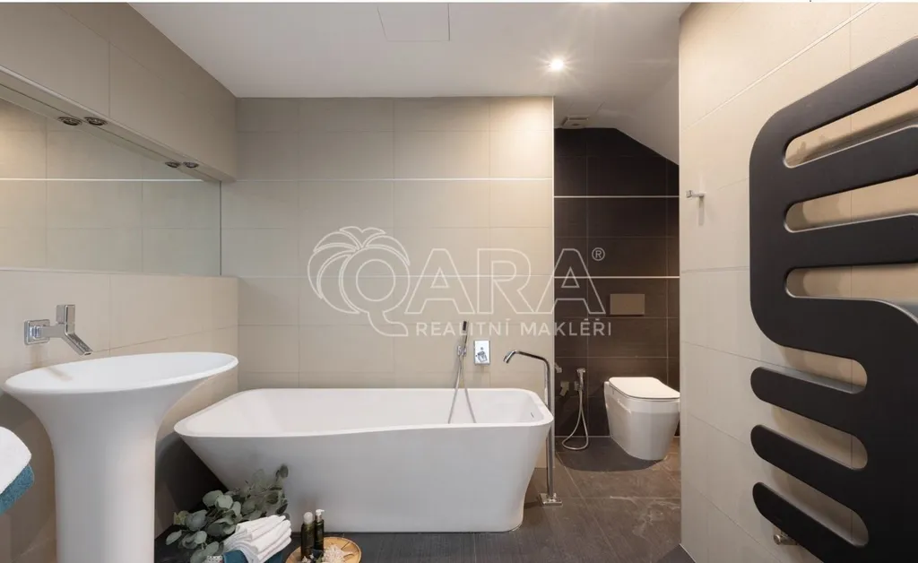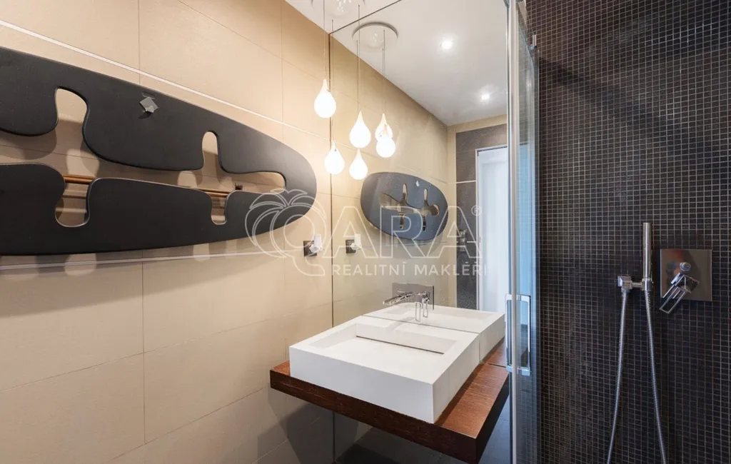 Dispozice 4+kk s velkou terasou je promyšleně rozdělena na dvě části soukromou a společenskou. Váš soukromý prostor je tak naprosto oddělen od návštěv, které mohou využít vlastní koupelnu se sprchou a šatnu, které jsou hned u vstupu. V zadní části bytu na vás čeká hlavní koupelna s vanou a elektrickým podlahovým topením, kde je i prostor pro pračku. Pro váš absolutní klid je byt vybaven alarmem.