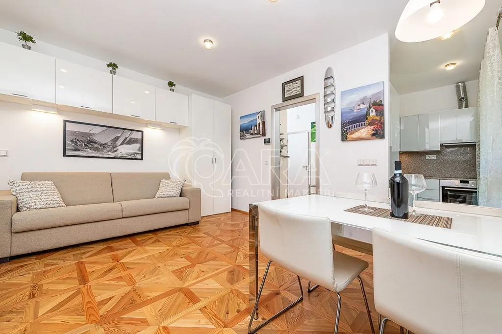 Interiér bytu je v nadstandardním provedení dřevěné podlahy, podlahové vytápění v koupelně, bezpečnostní vstupní dveře s videotelefonem, interiérové dřevěné dveře značky Sapeli, vestavěné skříně a praktické úložné prostory. Kuchyňská linka je vybavena veškerými spotřebiči. Nábytek na fotkách je součásti ceny bytu.