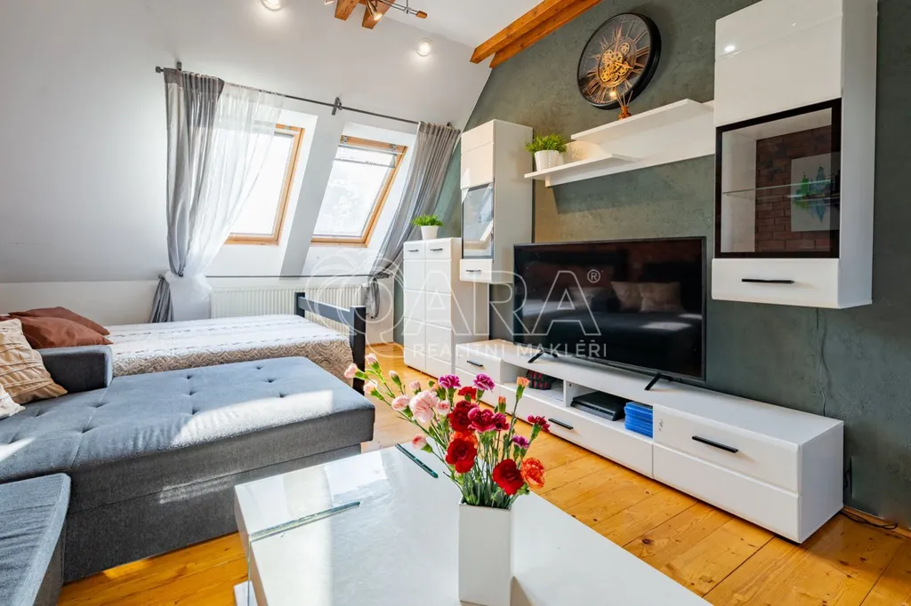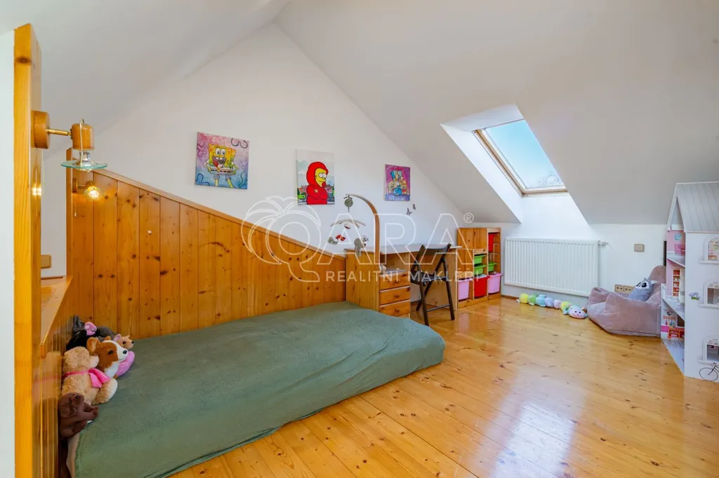 Obývací prostor: Světlý pokoj na JZ s krásným obkladem z lícových cihel. Má 2 střešní okna Velux , která zajišťují dostatek přirozeného světla po celý den.