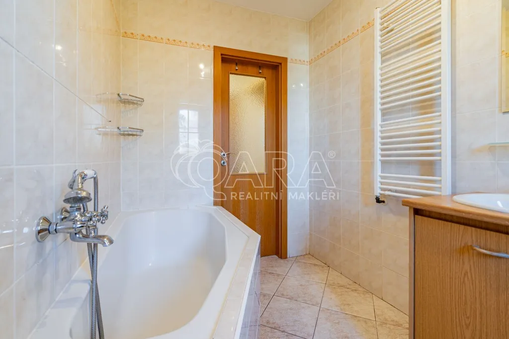 Zázemí: Koupelna spojená s toaletou s oknem do zahrady.