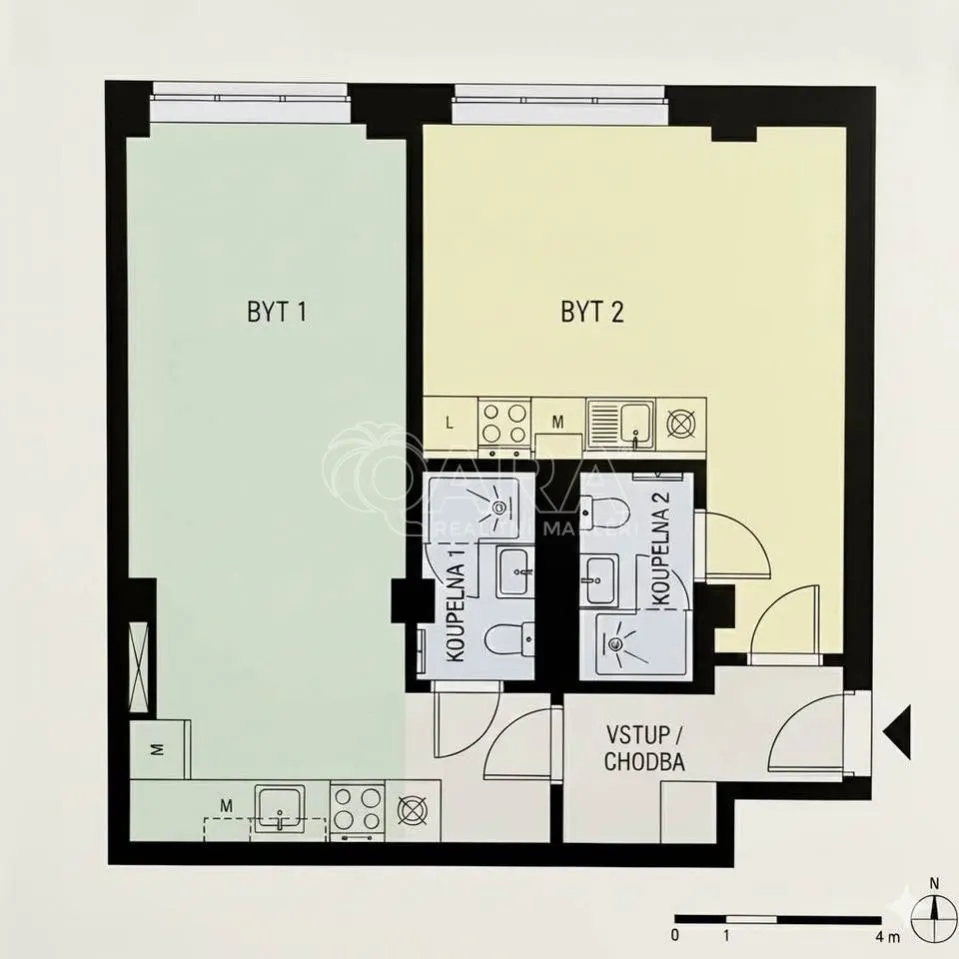 Interiér nabízí kvalitní materiály, jako jsou dřevěné podlahy a velkoformátová dlažba. Byt je vybaven moderní kuchyňskou linkou, obývací částí, koupelnou s vanou, toaletou a vstupní chodbou s úložným prostorem.