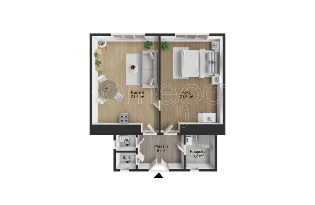 Byt dnes funguje jako 1+1, ale díky velikosti místností nabízí jednoduchou úpravu na dispozici 2+kk. Dispozice tuhle změnu přirozeně umožňuje bez složitých zásahů přesunutím kuchyně do obytné části vznikne plnohodnotný obývací prostor s kuchyňským koutem a samostatná ložnice, kde zároveň zůstává dostatek prostoru například pro pracovní kout nebo úložné prostory.