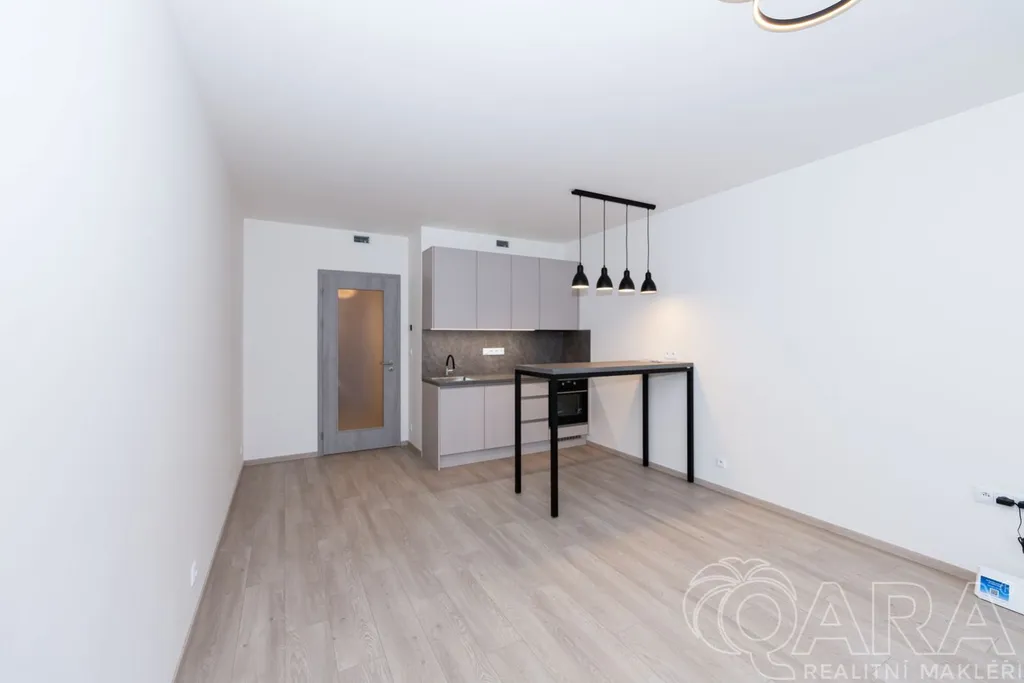 Byt je dispozičně členěn do vstupní chodby se šatní skříní, koupelny s toaletou, sprchovým koutem a pračkou, dále obytné místnosti s kuchyňskou linkou a vstupem do lodžie. Výhled z okna a vlastní lodžie orientovaná mimo rušnou silnici a tramvajovou trať. Součástí bytu je kuchyňská linka s jídelním stolem, robotický vysavač, modem pro připojení k internetu. Byt bude dovybaven velkou vestavnou skříní v předsíni a vestavnou lednicí a skříní v kuchyni. V ceně nájemného bytu je rovněž zahrnuta sklepní kóje v suterénu domu a kryté parkovací stání. Velmi nízké náklady (energetická náročnost B). Byt je vybaven rekuperací.