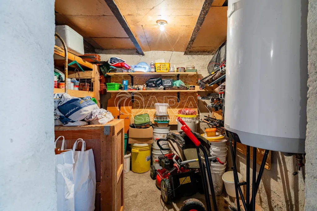 Suterén: Prostorná garáž s dílnou/sklepem a úložným prostorem.