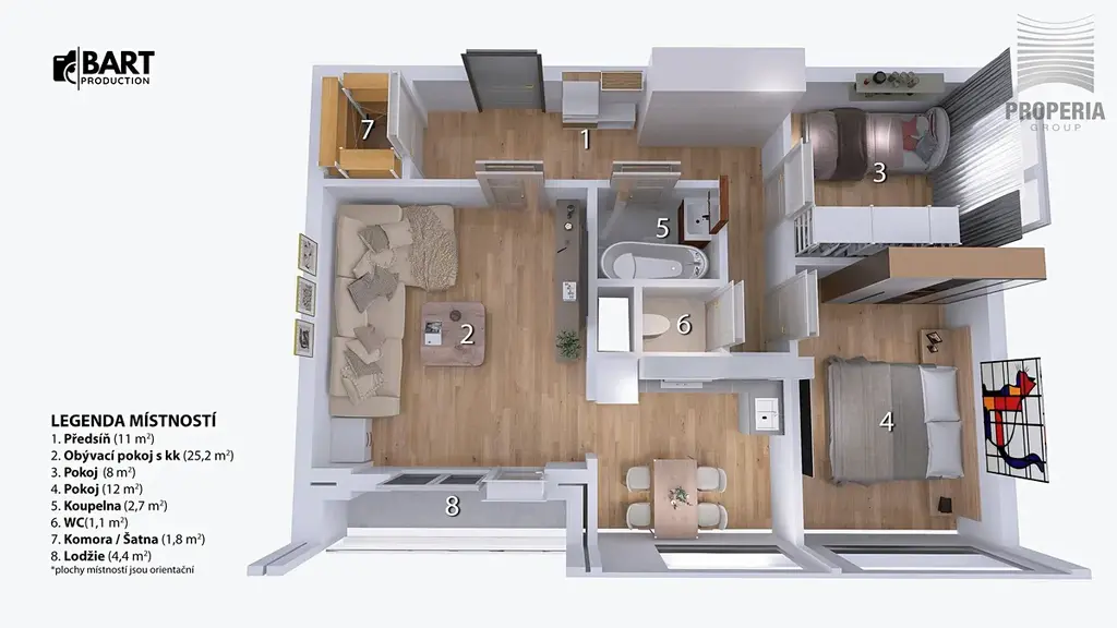 • Páry hledající prostor: Vlastní šatna a nadstandardně prostorný obývací pokoj uspokojí i náročné uživatele.