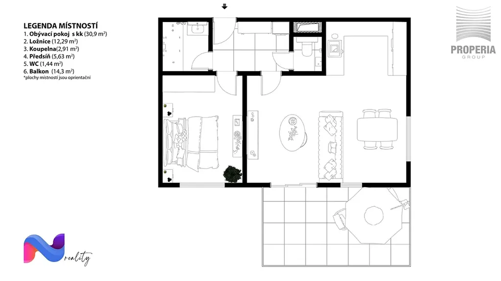 • Obývací pokoj s KK (30,90 m²): Dominanta bytu orientovaná na jih, vstup na balkon.