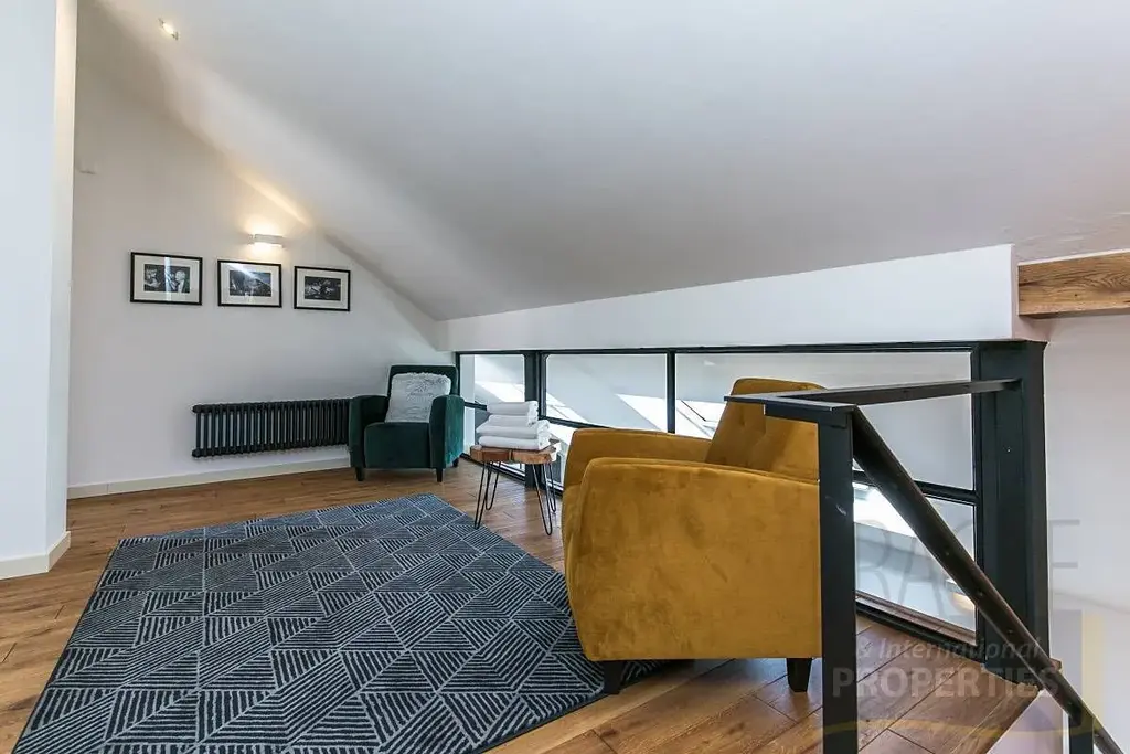 V horním patře najdete malou předsíň s příjemným posezením se vstupem do 2 ložnic s 2 plně vybavenými privátními koupelnami /vanou, sprchou a toaletou/. Obě ložnice jsou světle se střešními okny jižně orientovaná s výhledem do klidného vnitrobloku. Jedna z ložnic, také nabízí střešní terasu 6m2.