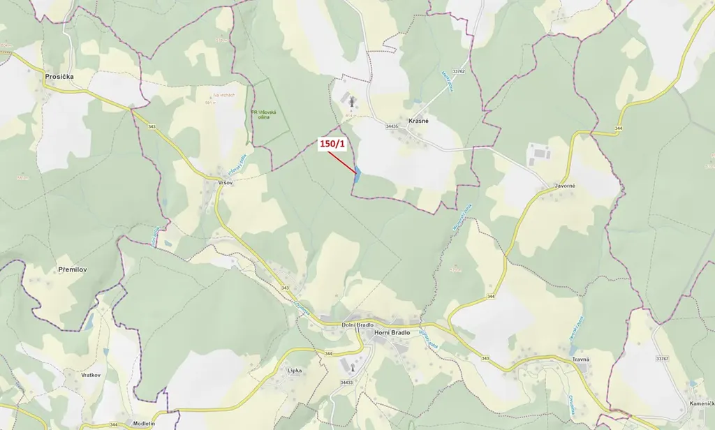 Lesní pozemek o výměře 6169 m2, parcelní číslo 150/1, podíl 1/1, katastrální území Krásné, obec Krásné, obec s rozšířenou působností Chrudim, okres Chrudim, Pardubický kraj.