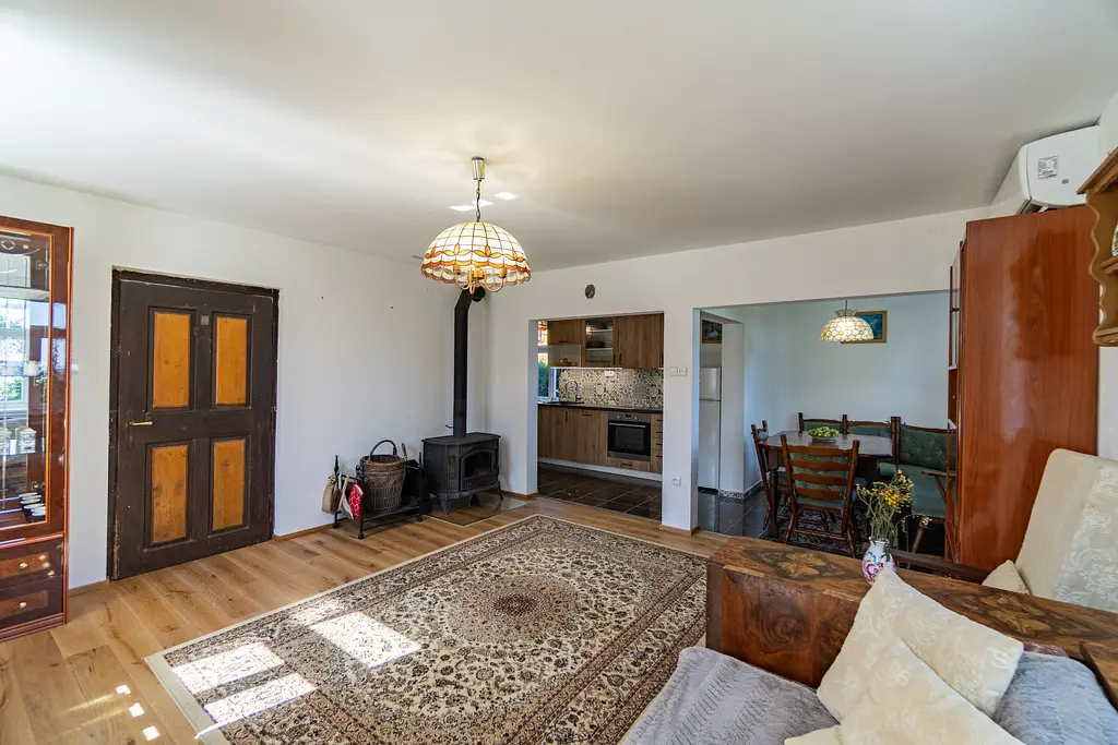 V obývacím pokoji jsou krbová kamna na tuhá paliva s rozvody do vyššího patra, která otápí přízemí a podkroví. V domě jsou 3 klimatizační jednotky, které v letě zajistí příjemnou teplotu v domě a v zimě jej bez problémů vytopí. V koupelně je podlahové vytápění.