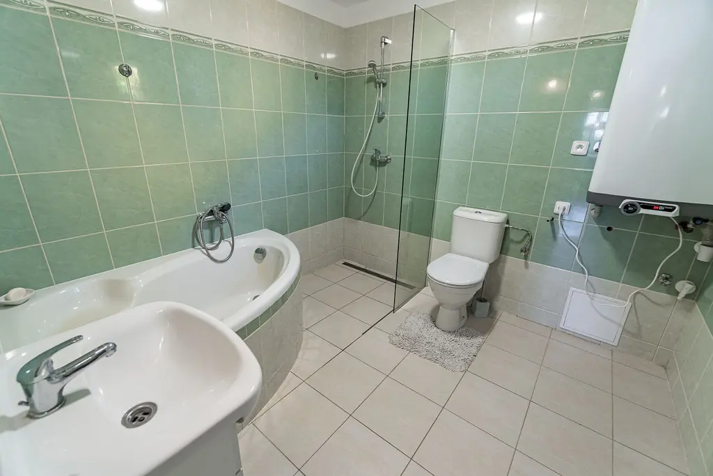 V koupelně je rohová vana, sprchový kout, umyvadlo a toaleta. Je zde také umístěný elektrický bojler o objemu 120l, který zásobuje dům teplou vodou.