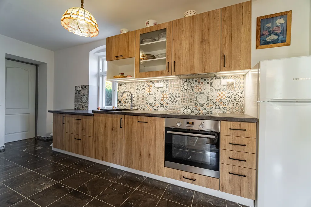 Kuchyňská linka je vybavena sklokeramickou varnou deskou, elektrickou troubou, digestoří, myčkou, lednicí a mikrovlnnou troubou.