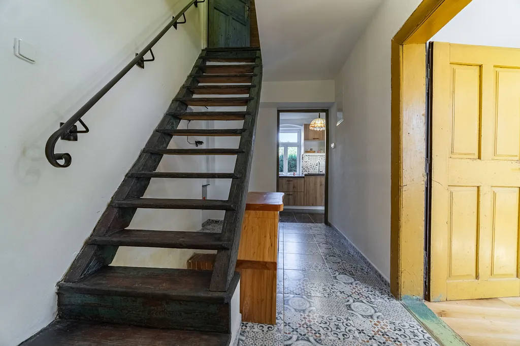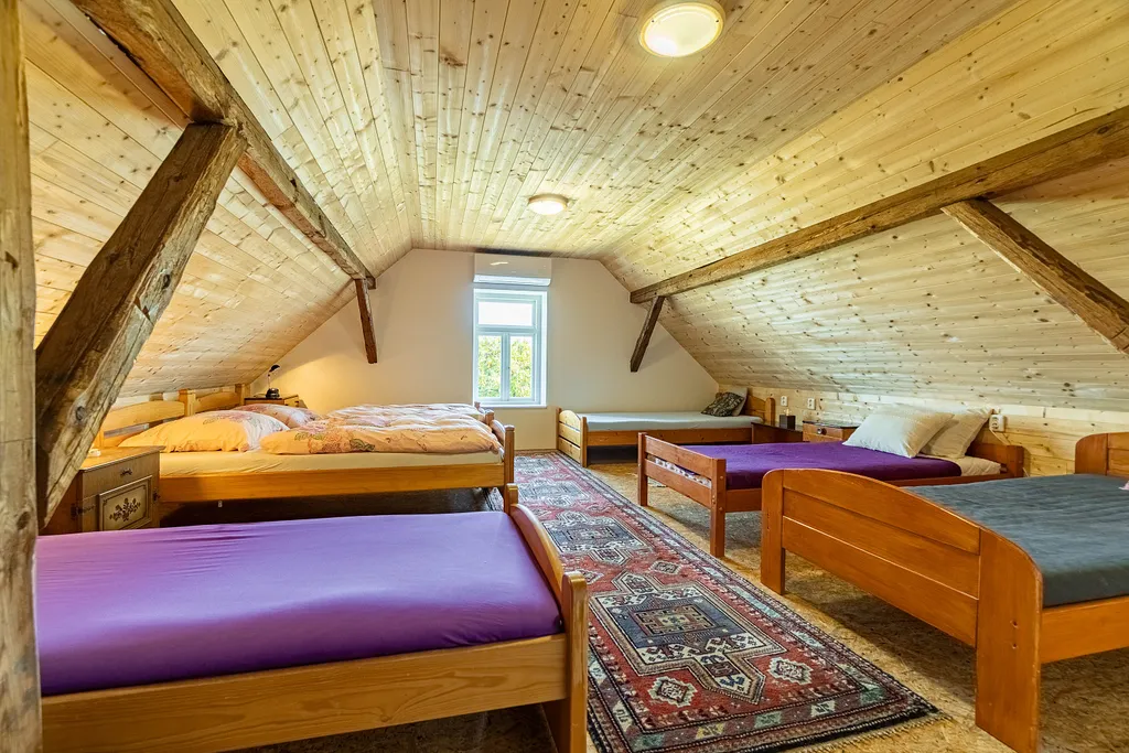 V přízemí domu se nachází kuchyň s jídelním prostorem, prostorný obývací pokoj, ložnice a velká koupelna s toaletou. V patře je poté velká ložnice pro 7 osob, která se po úpravách dá použít jako další 2 pokoje se samostatným vchodem.