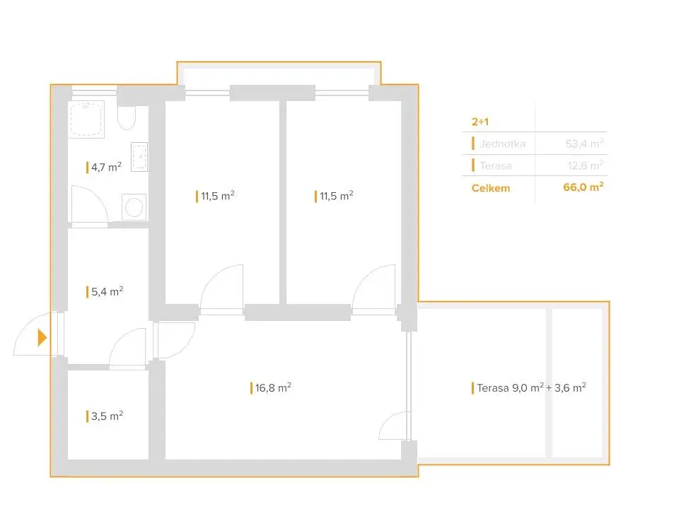 Dispozice jednotky je 2+1 a je velmi praktická a dobře využitelná – nabízí oddělenou ložnici pro klidný odpočinek, samostatný obytný prostor navazující na samostatnou kuchyni.