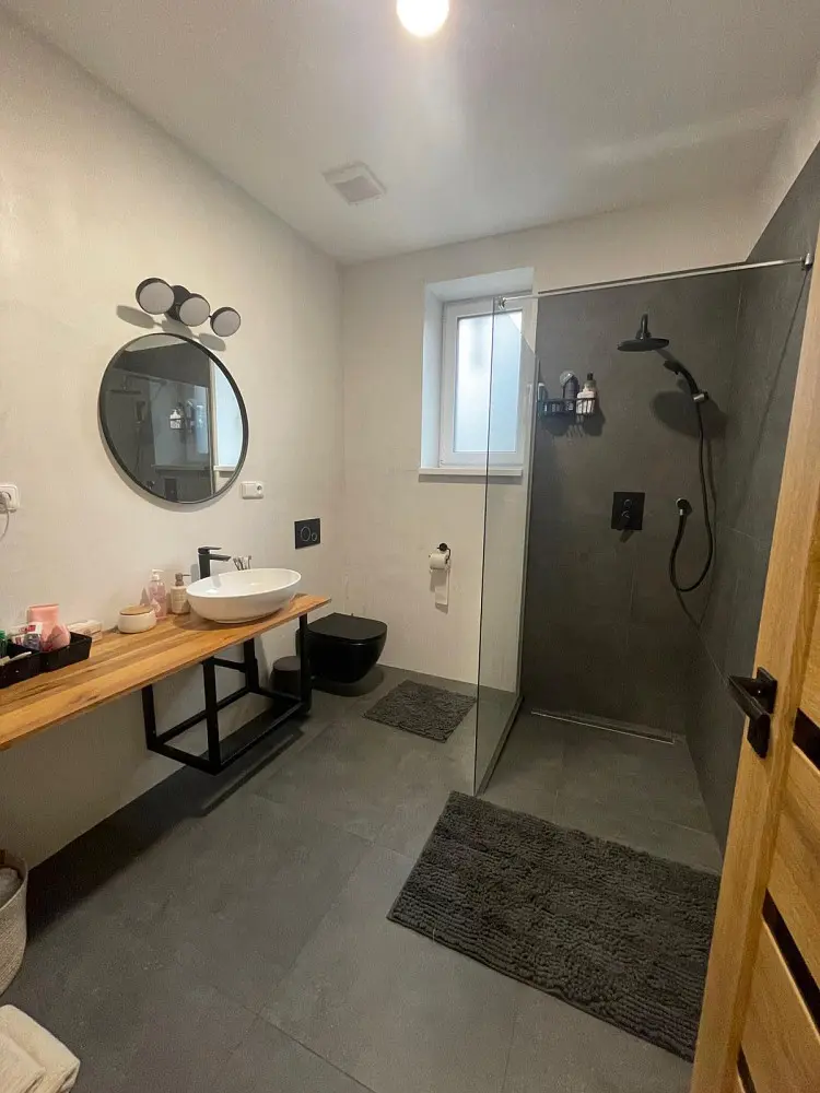Vkusně řešená koupelna se sprchovým koutem a Wc.