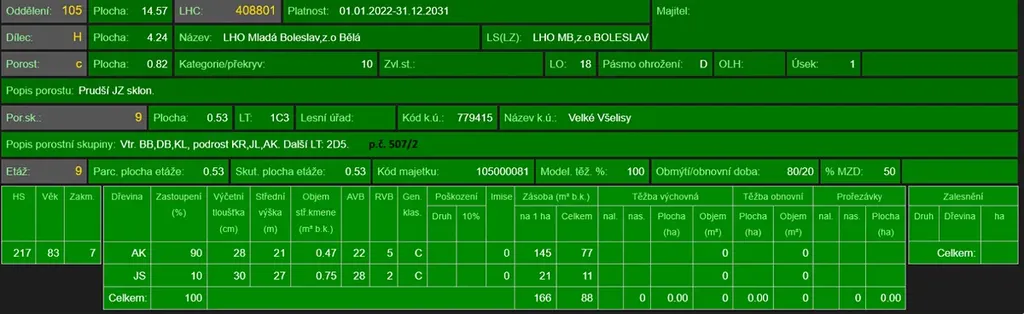- p.č. 507/2 vedená jako lesní pozemek o celkové výměře 5 287 m2 (stáří lesa 87 let - zastoupení dřevin akát, jasan),