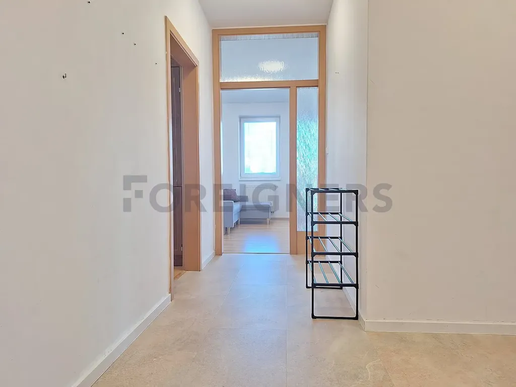 Byt se nabízí kompletně vybavený. Prostorná kuchyně s barem disponuje všemi spotřebičemi - lednicí, myčkou, elektrickou troubou, mikrovlnnou troubou, varnou deskou a digestoří. V obývacím pokoji naleznete jídelní stůl s židlemi, sedačku a konferenční stolek, dále také vstup na balkon cca 5m2 a vstup do pokoje disponujícího manželskou postelí s matrací.