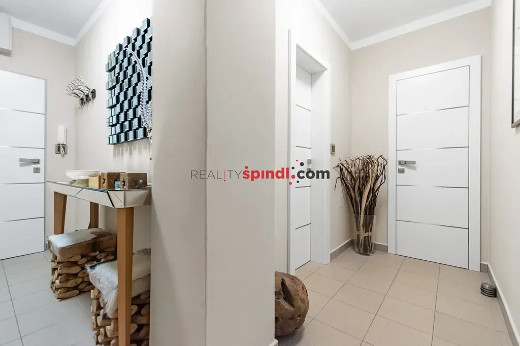 Součástí bytu je také vstupní chodba s vestavěnými úložnými prvky.