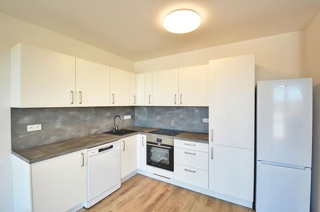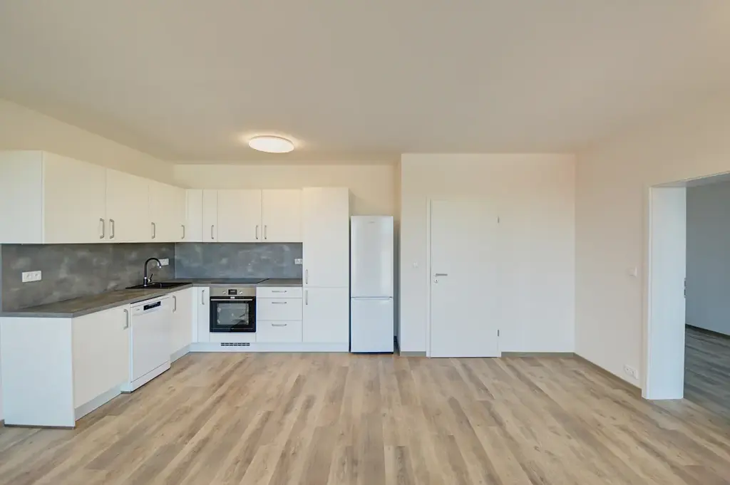 Byt je nabízen jako nezařízený, součástí je pouze nová kuchyňská linka s myčkou a lednicí, což dává budoucím nájemníkům možnost zařídit si interiér dle vlastních představ.