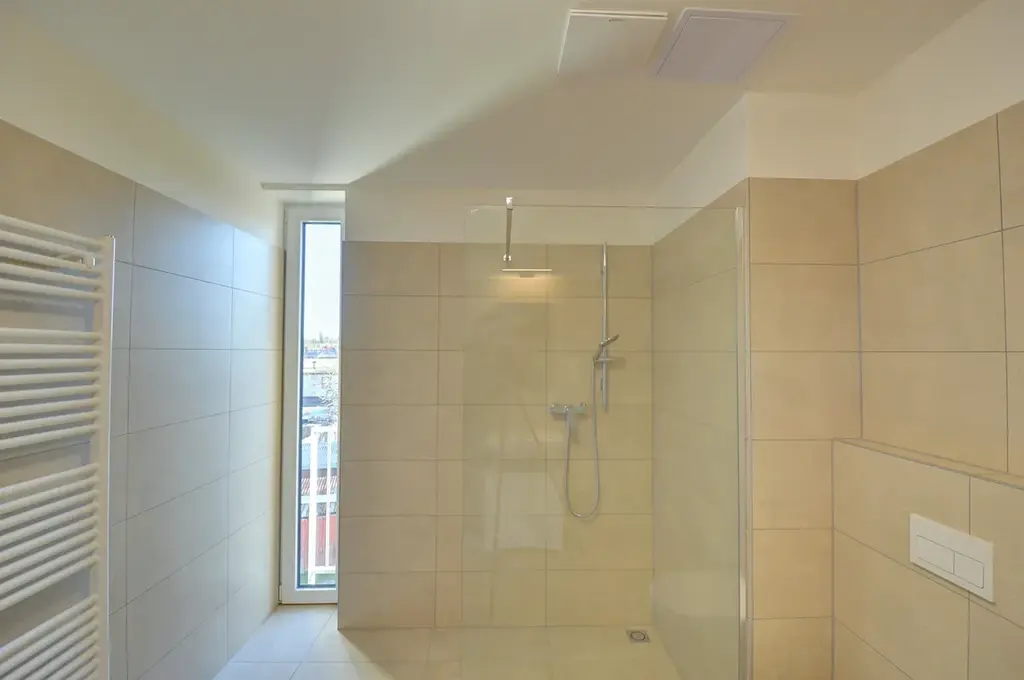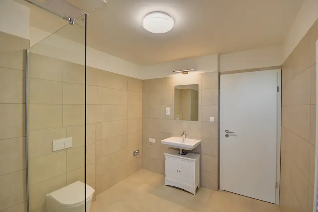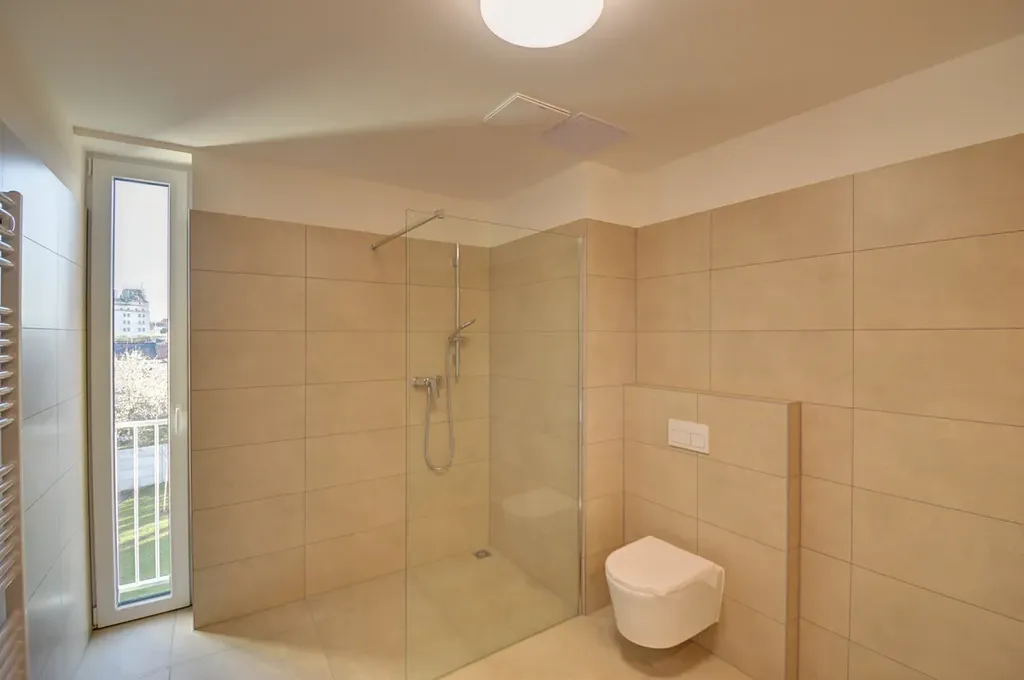 V obývacím pokoji jsou velká okna, který bytu poskytují dostatek přirozeného světla a navozují příjemnou atmosféru. Jsou situována tak, že do bytu není z dalších budov vidět a nabízí tak skvělé soukromí. Koupelna je prostorná s velkým sprchovým koutem a prostorem pro pračku i sušičku.