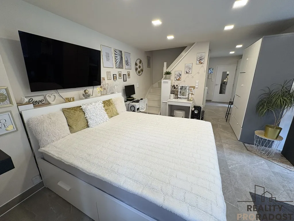 V obytném podkroví se nacházejí ložnice s dřevěnými podlahami a stylovým obvodovým LED osvětlením, které podtrhuje moderní charakter domu.