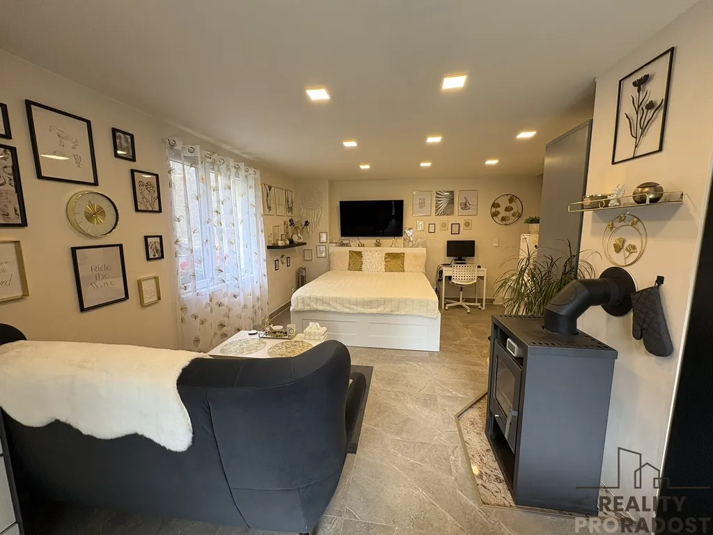 Obývací část s krbovými kamny plynule navazuje na venkovní terasu, kde můžete relaxovat při pohledu přímo do lesa či na pěkný pozemek.