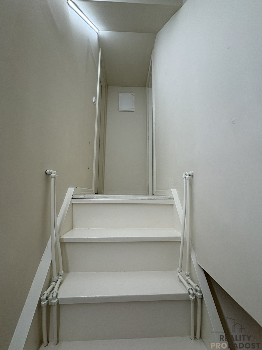 Koupelna disponuje moderním sprchovým koutem a čistým designem.