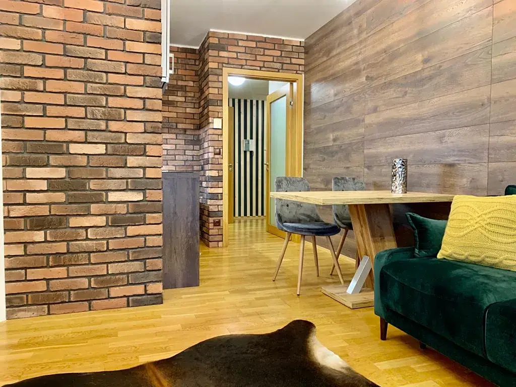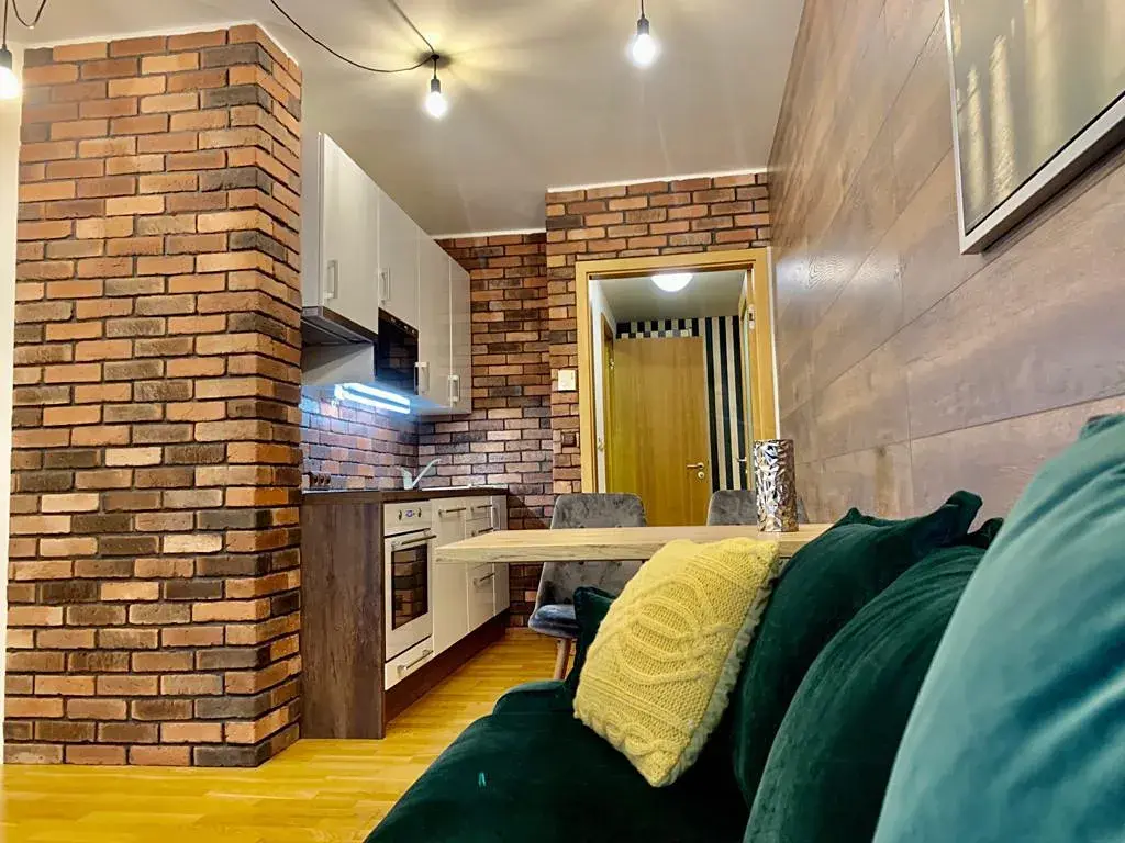 Byt zaujme na první pohled svým moderním interiérem s prvky industriálního stylu, kde se kombinují přírodní materiály, dřevo a designové cihlové obklady. Hlavní obytný prostor plynule propojuje obývací část s kuchyní a jídelním koutem, odkud je přímý vstup na prostornou terasu. Ta nabízí ideální místo pro relaxaci, ranní kávu i večerní posezení.