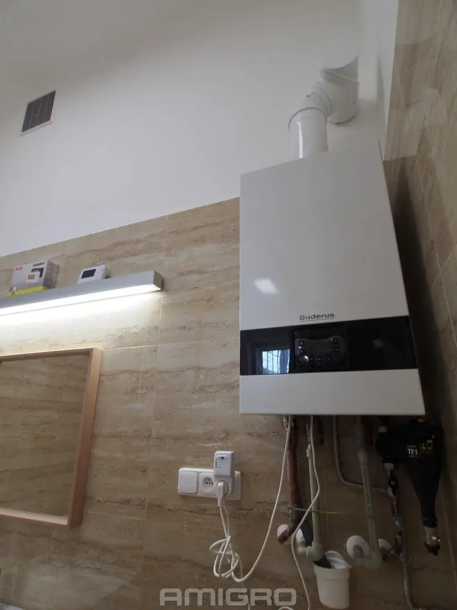 V koupelně je plynový kotel sloužící k ohřevu vody a vytápění bytu.