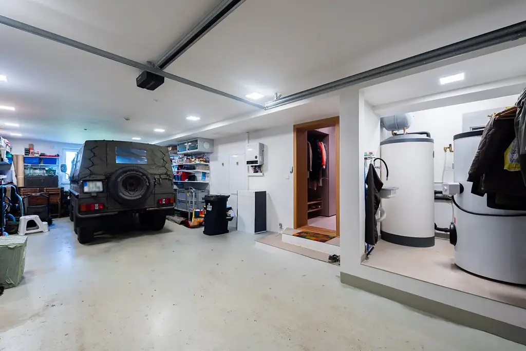Ve spodním patře domu se nachází prostorný obývací pokoj, kuchyně s plně vybavenou kuchyňskou linkou (vše řešeno na míru, spotřebiče Miele), prostorná zimní zahrada, větší ložnice, koupelna se sprchovým koutem a wc, spousta úložných prostor řešených na míru. Z prvního podlaží se taktéž dostanete do velké garáže, která lze využívat pro parkovaní dvou automobilů, případně taktéž jako další úložný prostor. Po schodech se dále dostaneme do druhého podlaží, kde se aktuálně nachází 4 ložnice, technická místnost a koupelna, kde je k dispozici sauna a otužovací sud. K dispozici je taktéž dobře přístupná půda, velmi praktická na uložení mj. sezonních věcí.