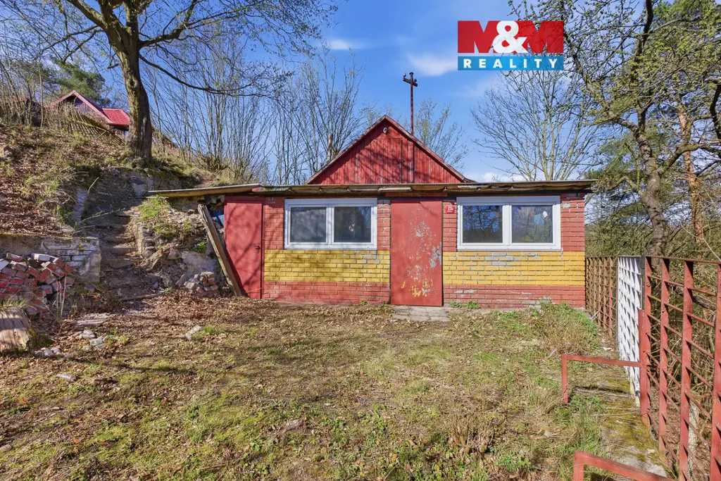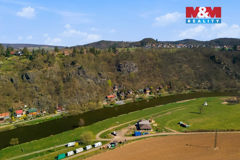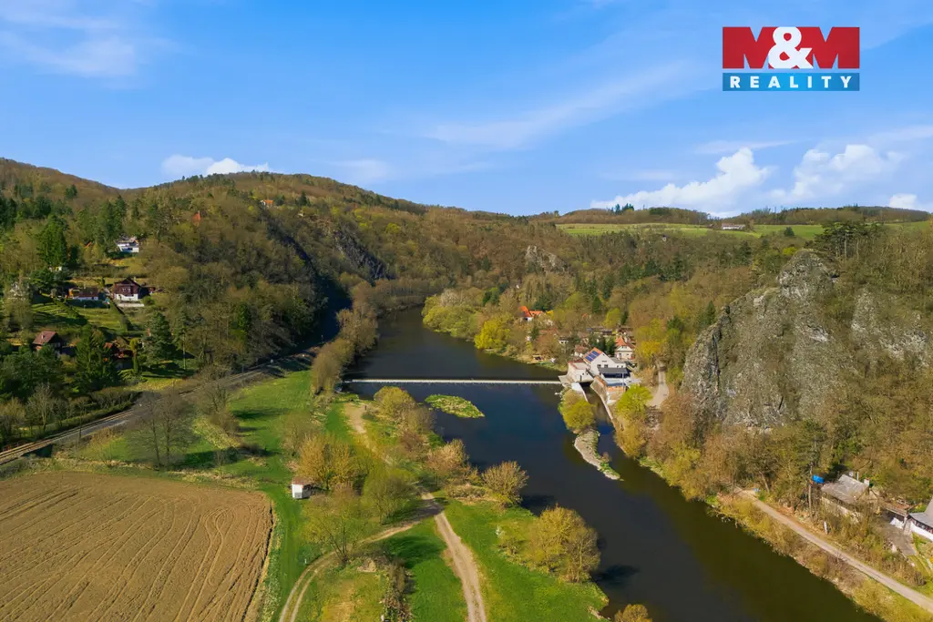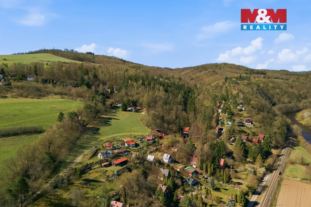 Pozemek je svažitý, ale právě to je jeho největší výhoda – nabízí krásné výhledy do krajiny a na řeku Berounku, která je jen kousek od chaty.