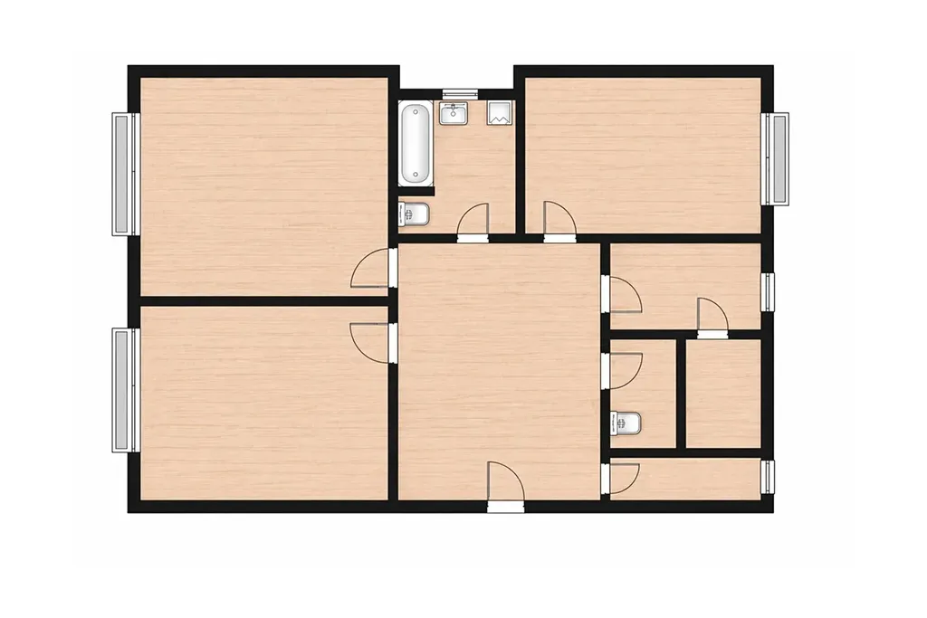 Na podlahách se nachází dřevěné parkety vhodné k renovaci. Okna bytu jsou orientována na jih, což zajišťuje dostatek denního světla po celý den. Část oken je na sever směrem do uzavřeného vnitrobloku, kde je k dispozici i společná zahrada. Okna jsou dřevěná, do ulice špaletová a do vnitrobloku euro okna. Kompletně vyměněny při rekonstrukci domu.