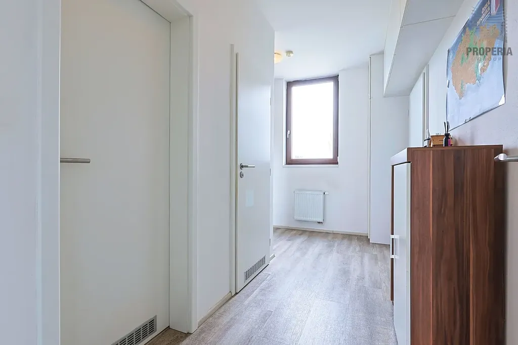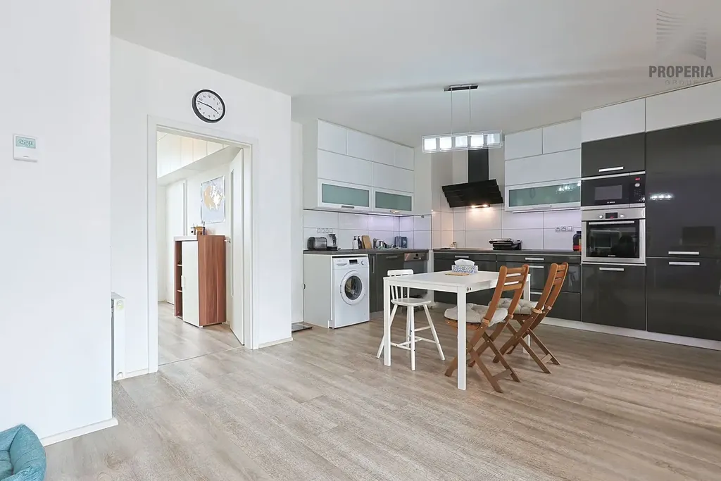 Součástí bytu je klimatizace a předokenní žaluzie pro zachování příjemné teploty i v letních dnech. Kuchyňská linka je nadstandardně vybavena, součástí myčka, trouba, indukce.