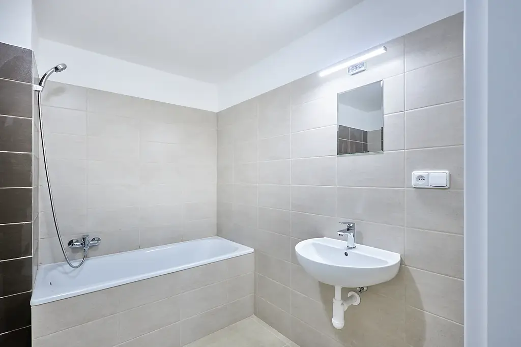 Byt disponuje kuchyňskou linkou s varnou deskou, troubou a digestoří. V koupelně je umístěna vana, topný žebřík a připojení na pračku. Budoucí nájemníci ocení vzdušnost celého bytu díky francouzskému oknu.