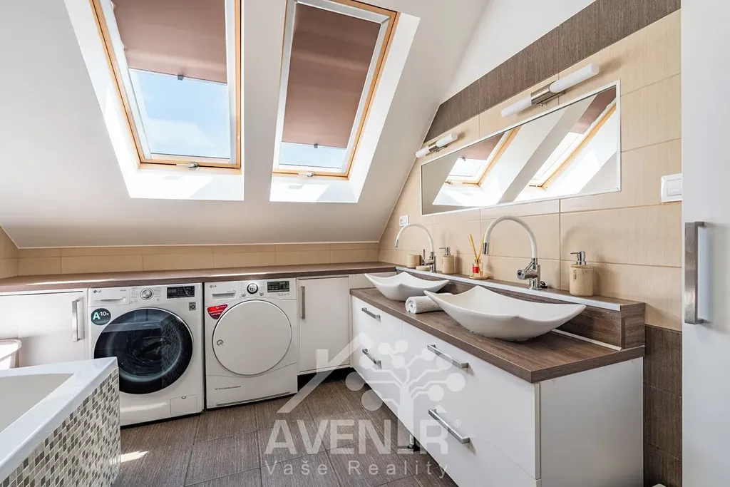 V přízemí vás přivítá prostorný obývací pokoj propojený s kuchyní a špíží, koupelna a také samostatný pokoj s vlastní kuchyňskou linkou a vstupem – ideální pro hosty, pracovnu nebo menší bytovou jednotku. V patře se nachází ložnice, tři další pokoje a velká koupelna.