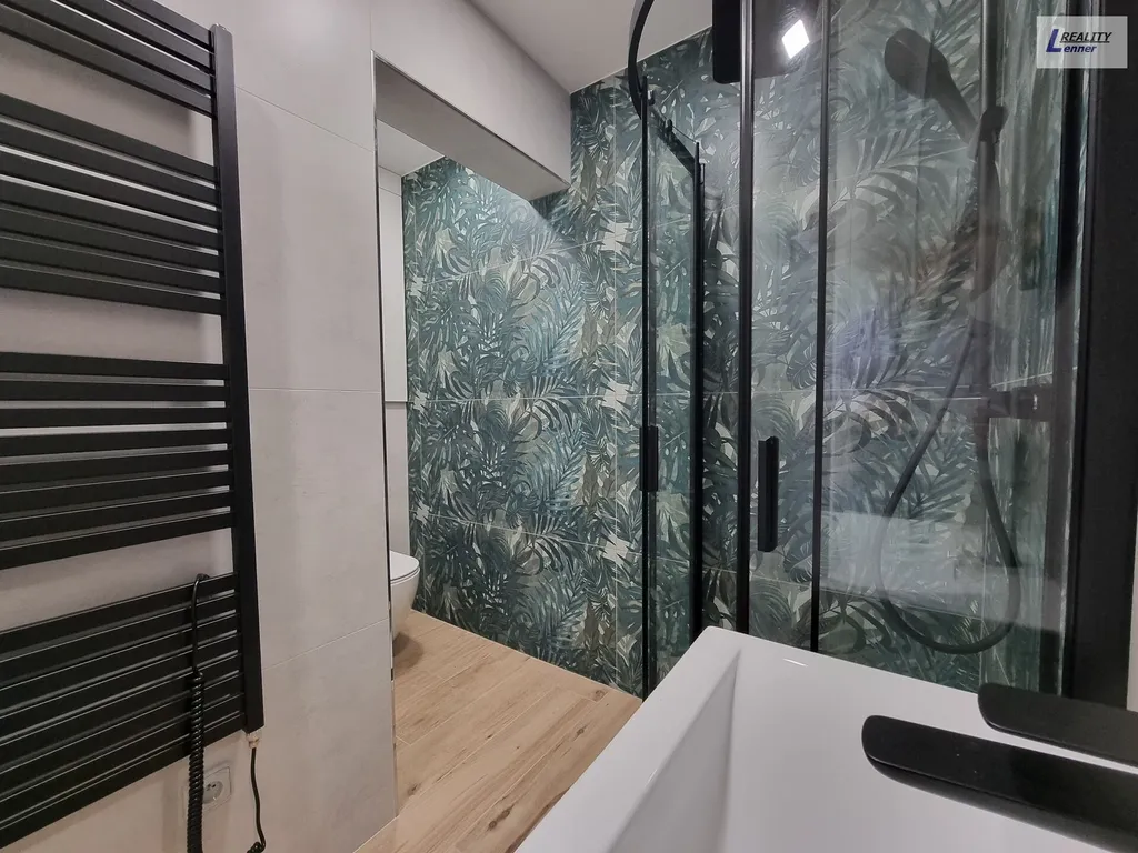 Koupelna je řešena ve velmi vkusném stylu se sprchovým koutem, WC Geberit, místem pro pračku a moderním vybavením. Celý byt působí vzdušně a nadčasově díky kombinaci světlých tónů a kvalitních materiálů.