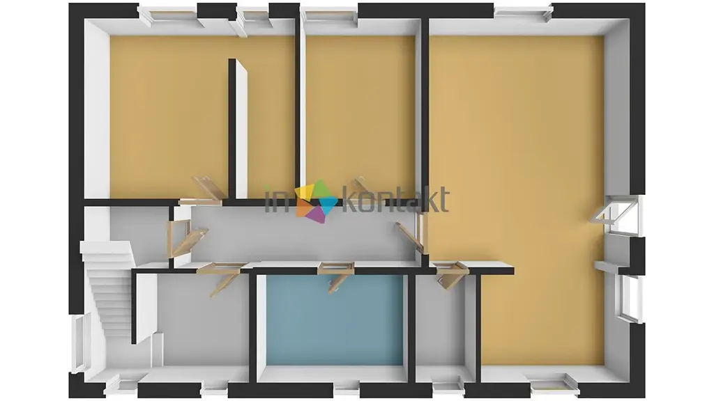 • 1. NP (Hlavní obytné patro): Srdcem domu je prostorný obývací pokoj s kuchyňským koutem, kde je již připraven vývod v komíně pro budoucí krbová kamna. Dále se zde nachází ložnice se šatním koutem, dětský pokoj (či pracovna), komora a koupelna s WC. V koupelně je připraveno napojení pro vanu, sprchový kout a velmi praktický shoz na prádlo přímo do suterénu. V celém tomto patře je již rozvedeno teplovodní podlahové vytápění a je zde nachystána kabeláž pro případnou instalaci klimatizace.