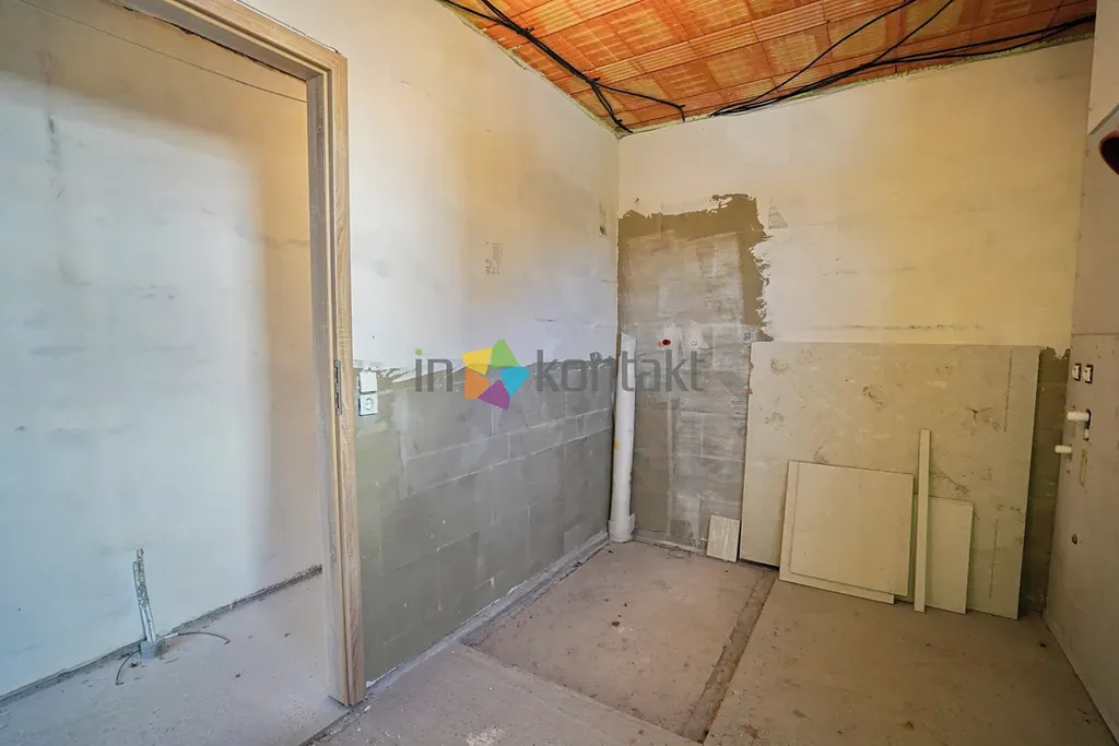 Aktuální stav a dokončení: Dům se prodává ve stavu rozestavěné stavby tak, jak je detailně zachyceno na fotografiích a v přiložených půdorysech. Budoucí majitel si tak sám podle svého vkusu a rozpočtu zajistí finální povrchy (výmalbu, podlahové krytiny), sanitu, interiérové dveře, kuchyňskou linku, venkovní úpravy soklu a finální zdroj vytápění.