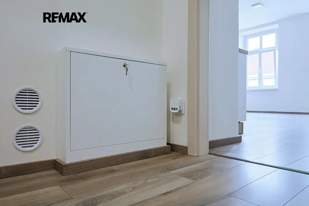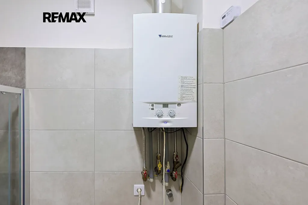 Podlahové vytápění zajišťuje plynový kotel zn. Vaillant, ohřev vody bojlerem. Do bytu je zavedeno internetové a TV připojení od společnosti O2.