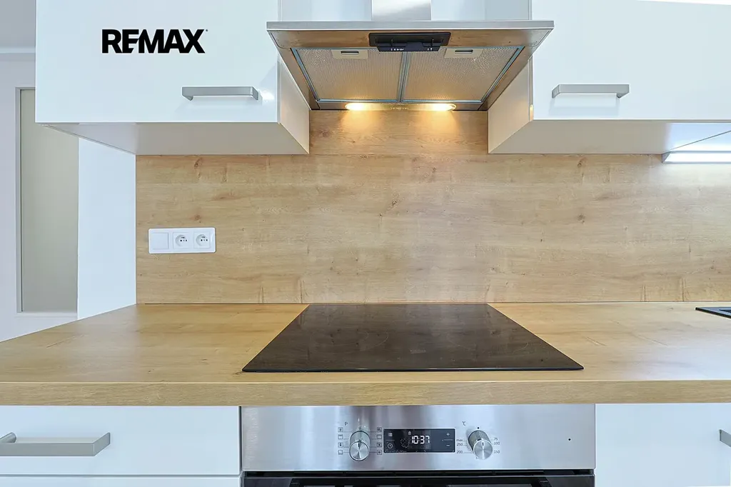 Vybavení kuchyňské linky: myčka, sklokeramická varná deska, el. trouba, recirkulační digestoř.