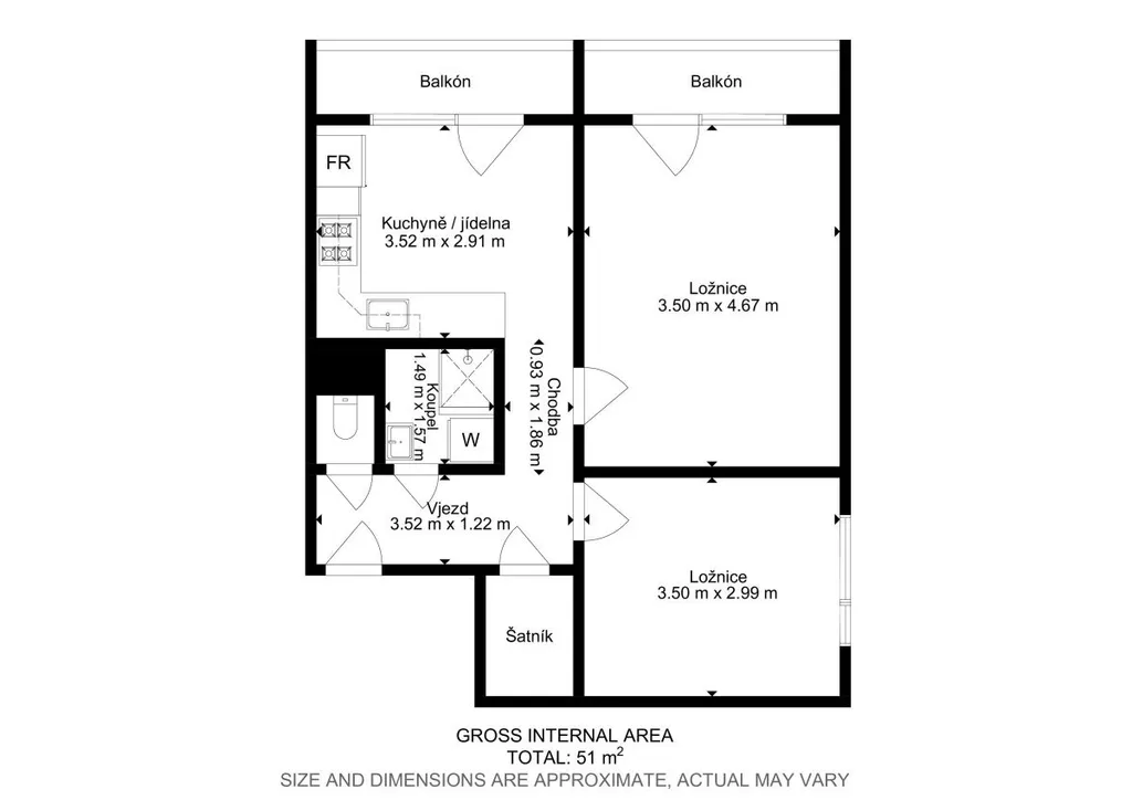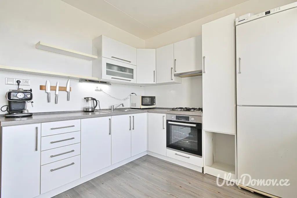 Dispozice bytu je velmi praktická, jednotlivé pokoje jsou neprůchozí a poskytují dostatek soukromí. Kuchyň je vybavena kuchyňskou linkou s lednicí, mikrovlnnou troubou, elektrickou troubou a plynovým sporákem s digestoří. Z kuchyně je vstup na první lodžii, která nabízí příjemné místo pro odpočinek.