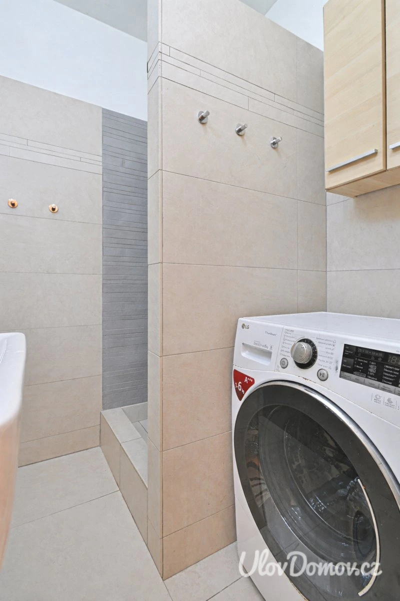 Koupelna je vybavena sprchovým koutem, umyvadlem se zrcadlem a pračkou. Toaleta je oddělená. Velkou výhodou bytu je samostatná šatna, která nabízí dostatek úložného prostoru. K bytu náleží také sklepní kóje.