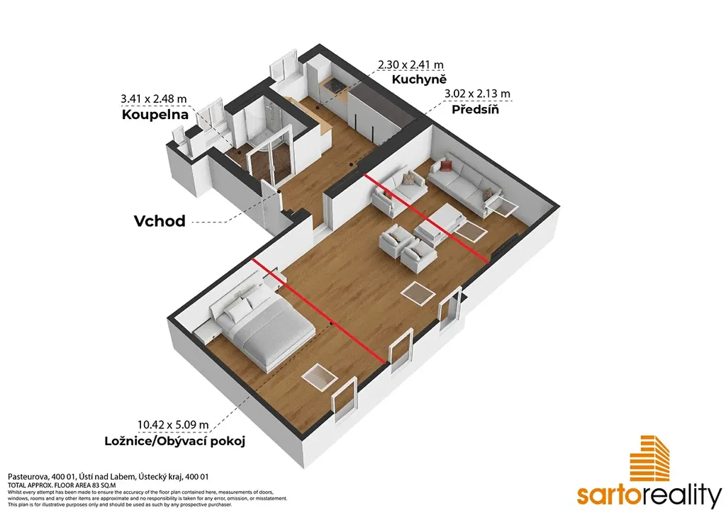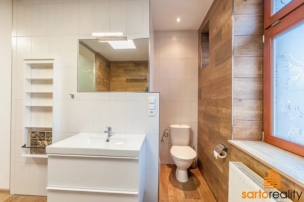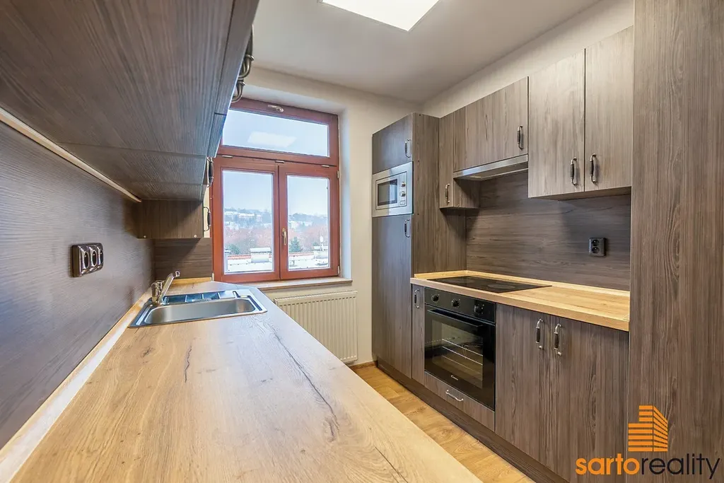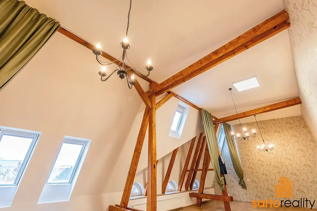 Při rekonstrukci, včetně těch zásadních instalací jako jsou nové rozvody elektra, topného systému, vodoinstalací a zateplení, zde byly položeny podlahové krytiny, osazen moderní plynový kondenzační kotel Wiessmann, zrenovovány přiznané trámové konstrukce a SDK podhledy aj. Dále zde najdete prostornou koupelnu s WC a sprchovým koutem, které dominuje designová prosklená zašupovací stěna. Okna jsou převážně dřevěná + střešní. K vyššímu standardu dnes patří i elektronické zabezpečovací zařízení. Na míru zhotovená kuchyňská linka je včetně vestavěných spotřebičů - sklokeramic. deska Gorenje, myčka Indesit, horkovzdušná trouba aj. Hlavní obytný prostor bytu je orientován na západ, pohledem na univerzitní kampus UJEP, koupelna a kuchyně jsou orientovány na východ do vnitrobloku.
