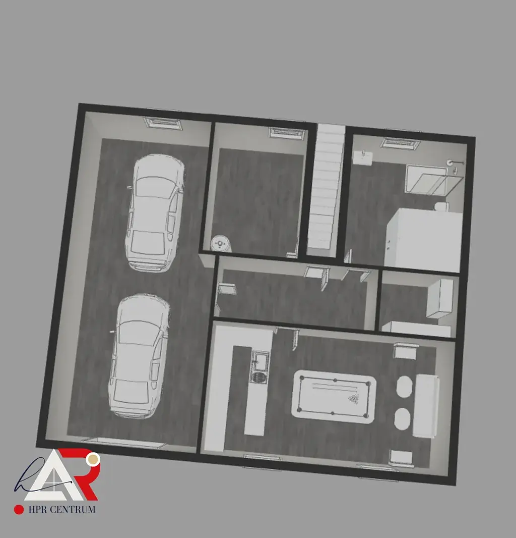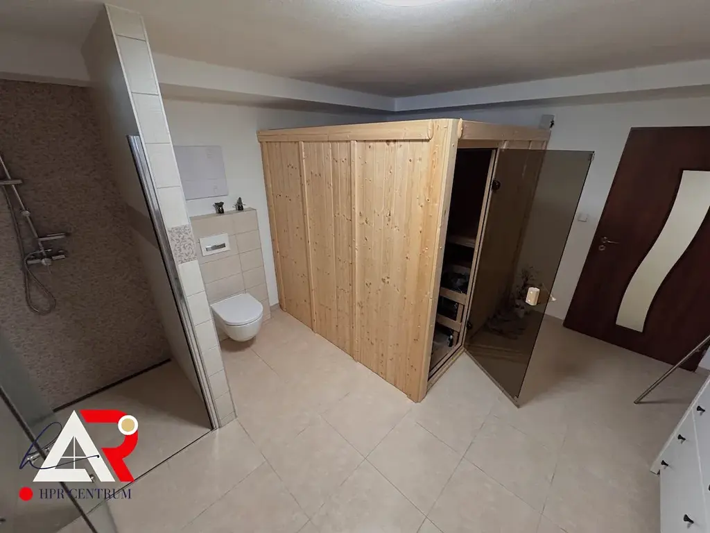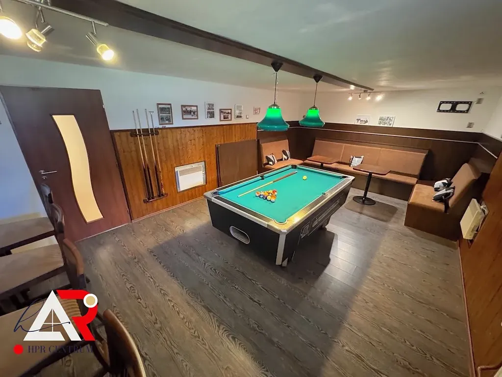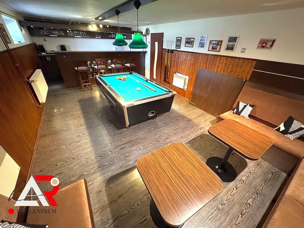 • Suterén: garáž pro 2 vozidla s dostatkem prostoru pro dílnu, společenská místnost s kulečníkem a barem, sauna se sprchou a WC